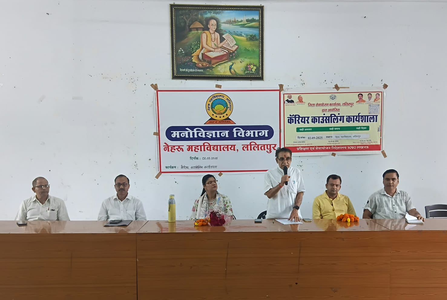 ललितपुर। आज दिनांक 2 सितंबर 2025 को जिला सेवायोजन कार्यालय, ललितपुर एवं मनोविज्ञान विभाग नेहरू, महाविद्यालय ललितपुर के संयुक्त तत्वाधान में करियर काउंसलिंग कार्यशाला का आयोजन किया गया। कार्यशाला की अध्यक्षता करते हुए महाविद्यालय के प्राचार्य प्रोफेसर ओमप्रकाश शास्त्री ने कहा कि करियर केवल नौकरी नहीं बल्कि जीवन की एक दिशा है। विद्यार्थी को अपनी क्षमता एवं अभिरुचि के अनुसार अपना लक्ष्य निर्धारित करना चाहिए, विद्यार्थी को जिस विषय में रुचि हो उसी का अध्ययन करना चाहिए। साथ ही अपने व्यक्तित्व के अनुसार करियर विषयों का चयन करें तथा आत्मविश्वास बनाए रखें एवं सकारात्मक दृष्टिकोण अपनाये।